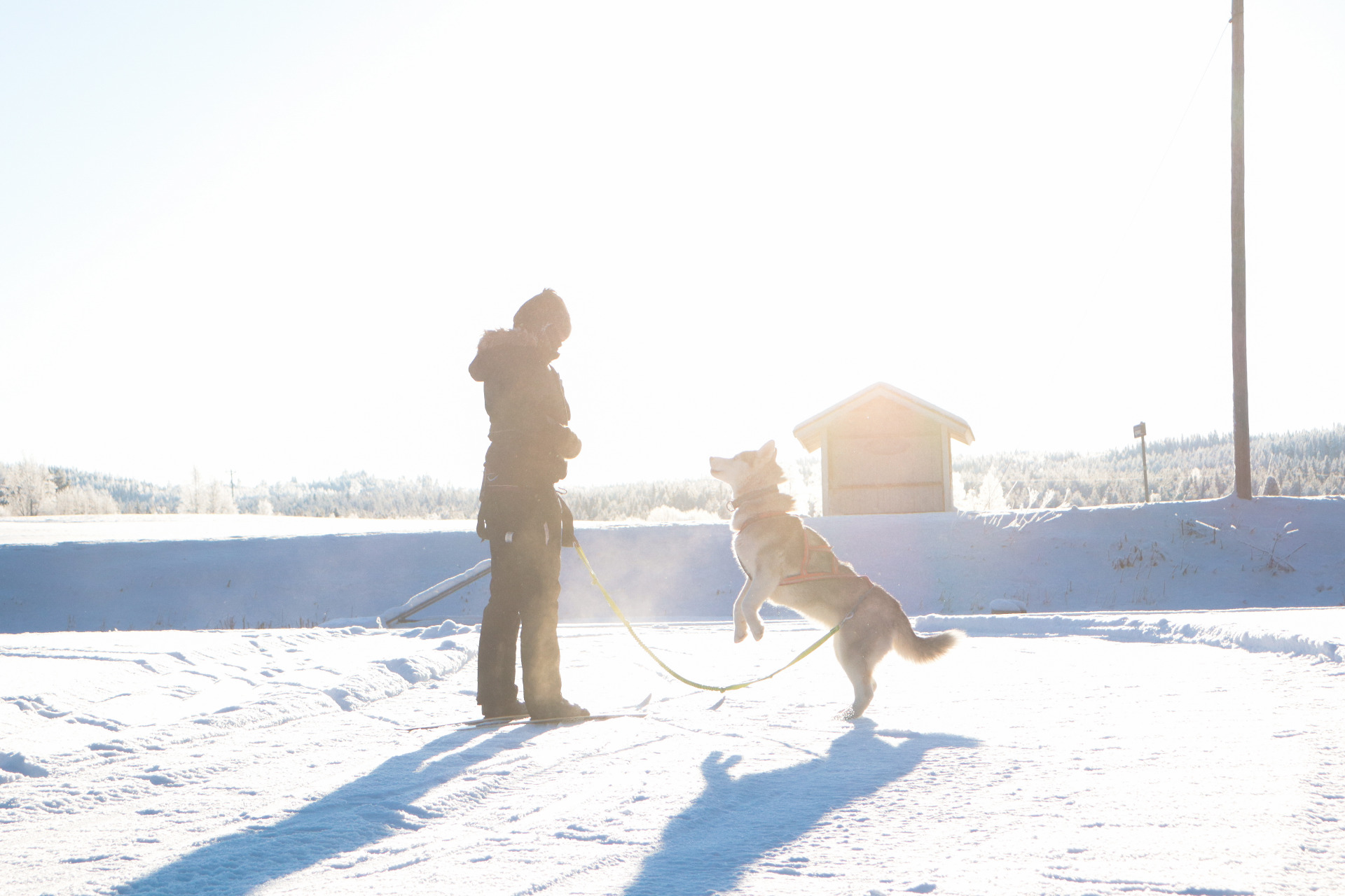 Harrastusvuoroille saavutaan vain asianmukaisilla varusteilla, esim. koirahiihtoa varten: